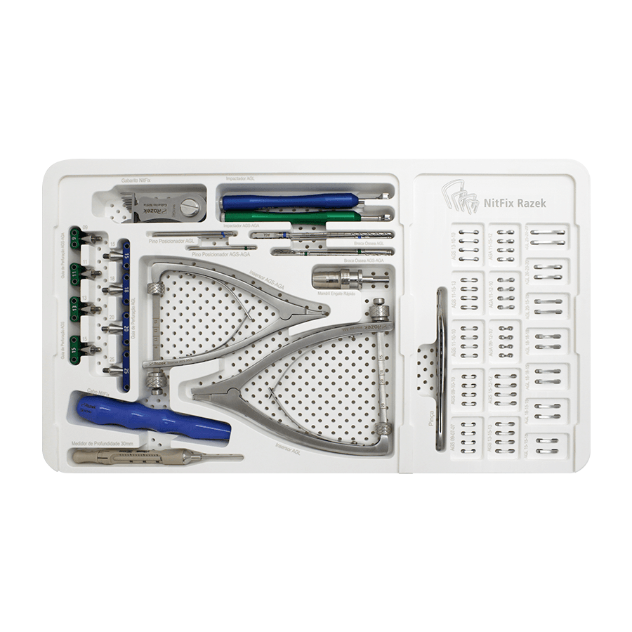Os Instrumentais para Materiais Implantáveis – NitFix Razek possuem a função de fornecer ao cirurgião os instrumentos necessários para a implantação do NitFix Razek, de maneira rápida e precisa.